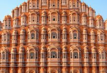 قصر هوا محل (قصر بادها) قصر هوا محل (کاخ بادها) در قلب جیپور، با نمای پنج طبقه ای و پنجره…
